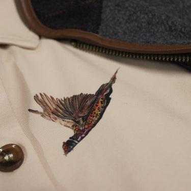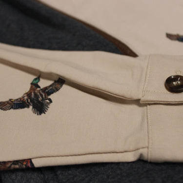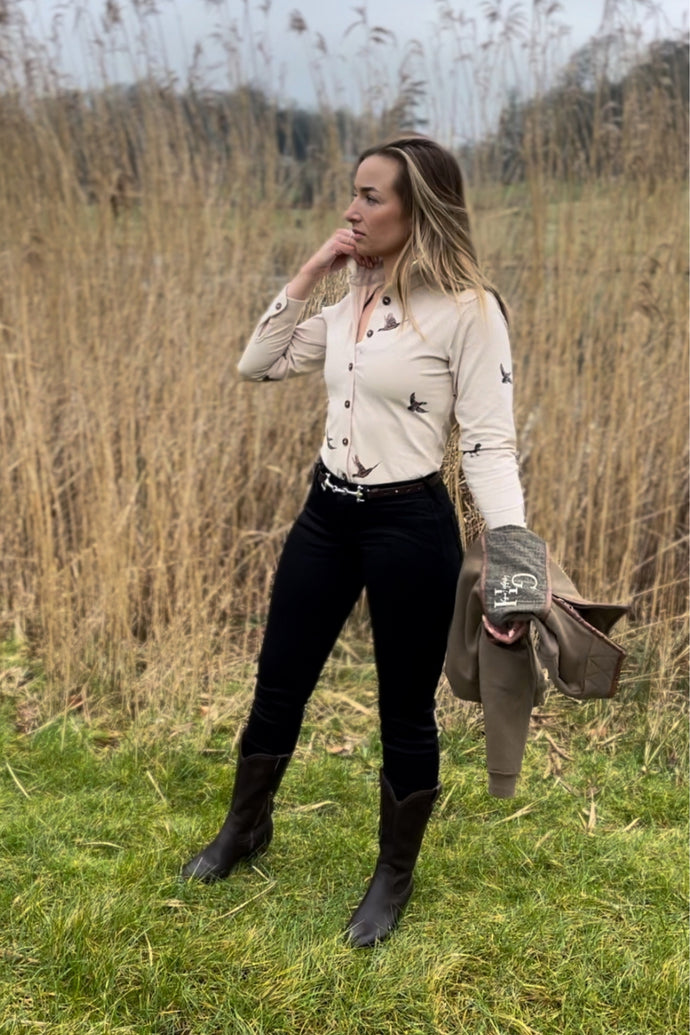 Introducing our Wildfowl Ladies Shirt, a beautifully crafted piece adorned with a hand-drawn and painted Pheasant, duck, and feather pattern by a talented local artist.